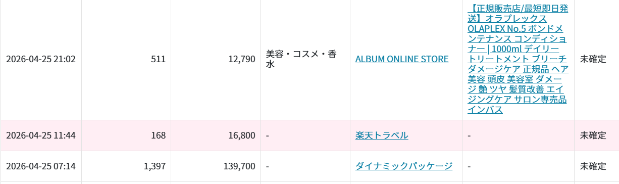 うーんと、あ!アメブロではじめて楽天トラベルの申込(楽天アフィリエイト管理画面の計測ID区別ではAmeba Pick Travel (5%)と表示)がありました(*´ω`*)一度に10~20万円という大きな金額での楽天トラベル申込はnoteばかりだったので、アメブロでは初です♪わたしのアメブロの家族旅行の記事から申し込んでいただいたのかしら?うれしいです。